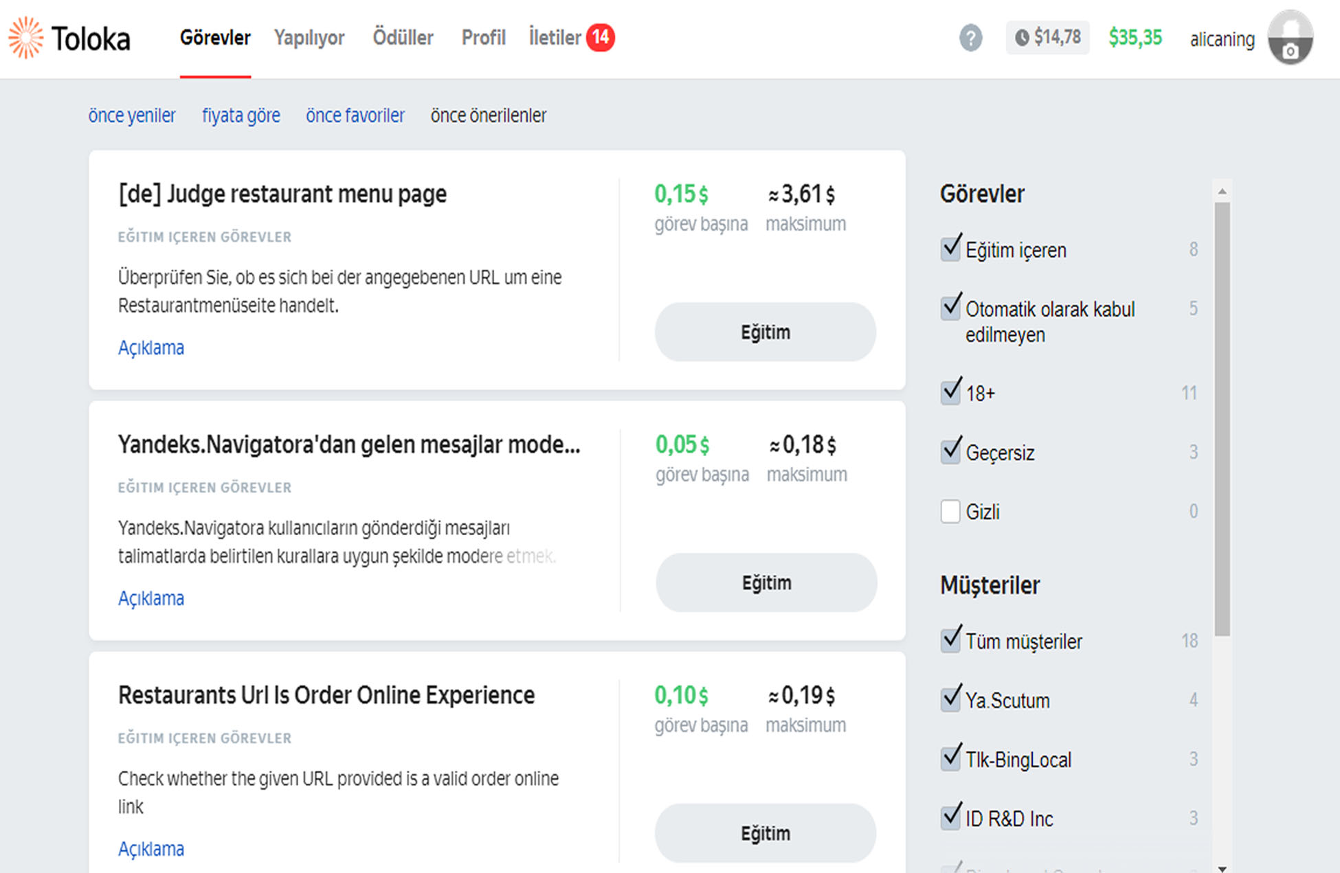 Yandex tolokaya kayıt olurken size hangi dilleri bildiğinizi soruyor ve seçtiğiniz dillerden size görevler veriyor yani burada ne kadar fazla dil biliyorsanız o kadar avantajlısınız. Sadece türkçe biliyorsanız da en azından 2. dil olarak ingilizceyi seçmeniz size çok katkı sağlayacaktır zaten çok complex bir ingilizce kullanmıyorlar basit düzeyde bilseniz yeter. Yani kısacası tolokada 30dan fazla farklı görev çeşidi var ve o görevlere uygun fiyatlandırmaları var. Görevleri burada anlatmak zor olur siz kayıt olup rahatça görevleri inceleyebilirsiniz. Genelde soru sorup şıklar arasından seçim yapmanızı istiyor. Bir görevi ilk kez yapıyorsanız o görev eğitim görevi olacaktır o eğitim görevlerinde ne kadar yüksek puan alırsanız o kadar yüksek fiyatta para kazandıran görevlere erişebilirsiniz. Ve siz görev yaptıkça profil puanınız artıyor ve profil puanınız ne kadar yüksek olursa o kadar yüksek fiyatlı görevlere erişebilirsiniz bu yüzden bol bol görev yapmak çok önemli.